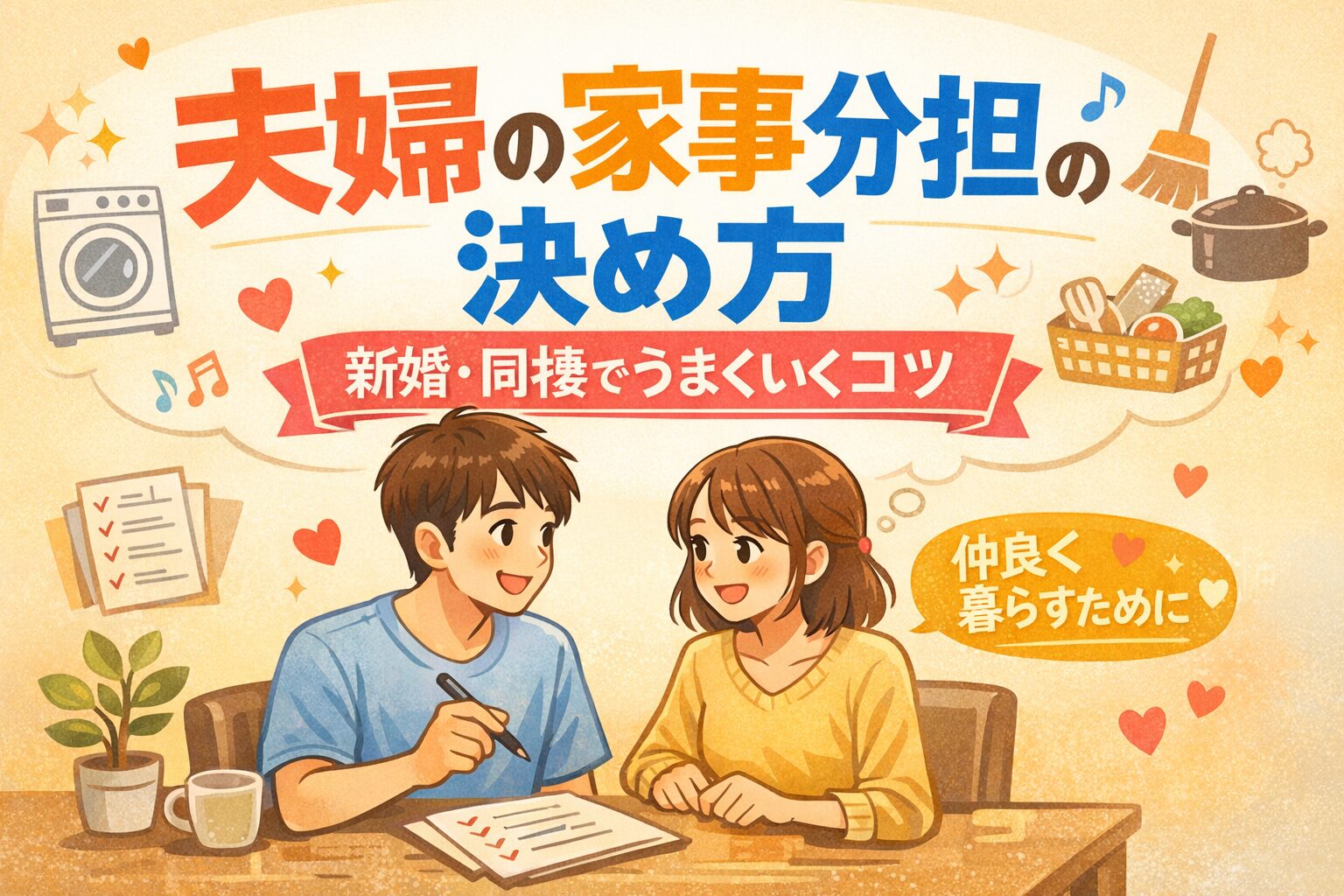 新婚や同棲の家事分担は、最初に話し合っておくことで後からのストレスを減らしやすくなります。